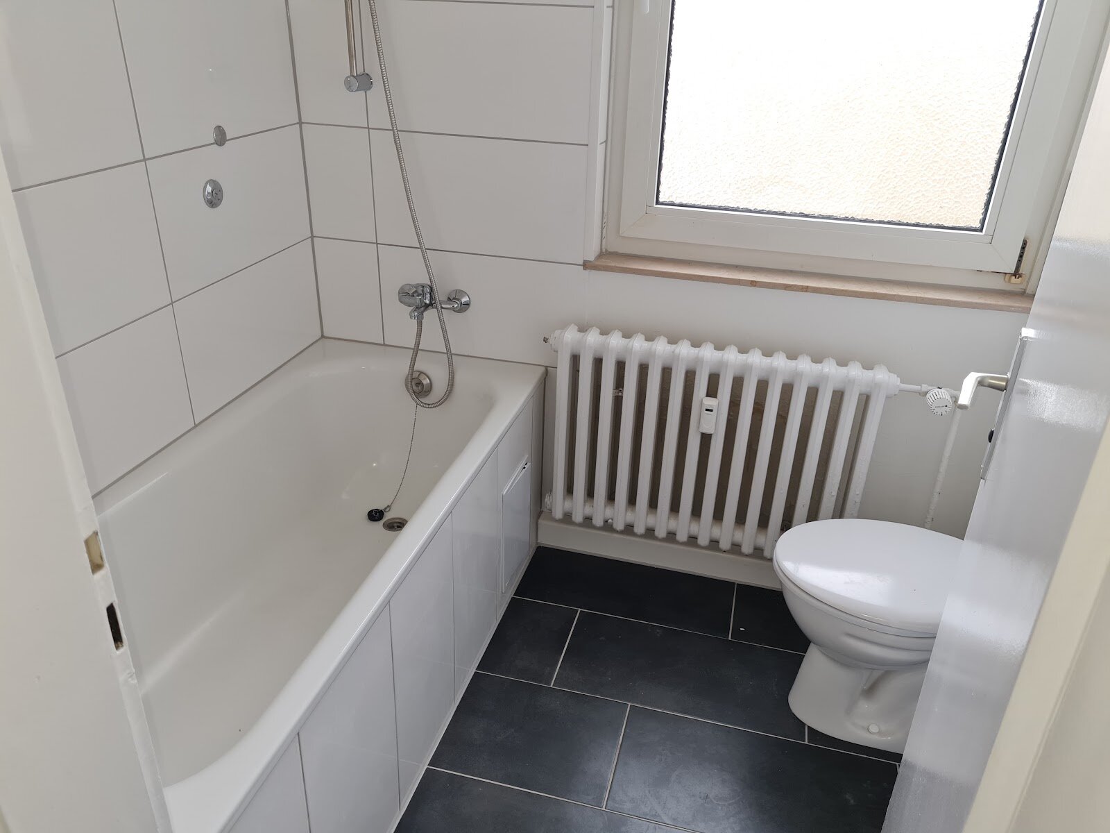 - Anthrazite Boden- und weiße Wandfliesen im Bad