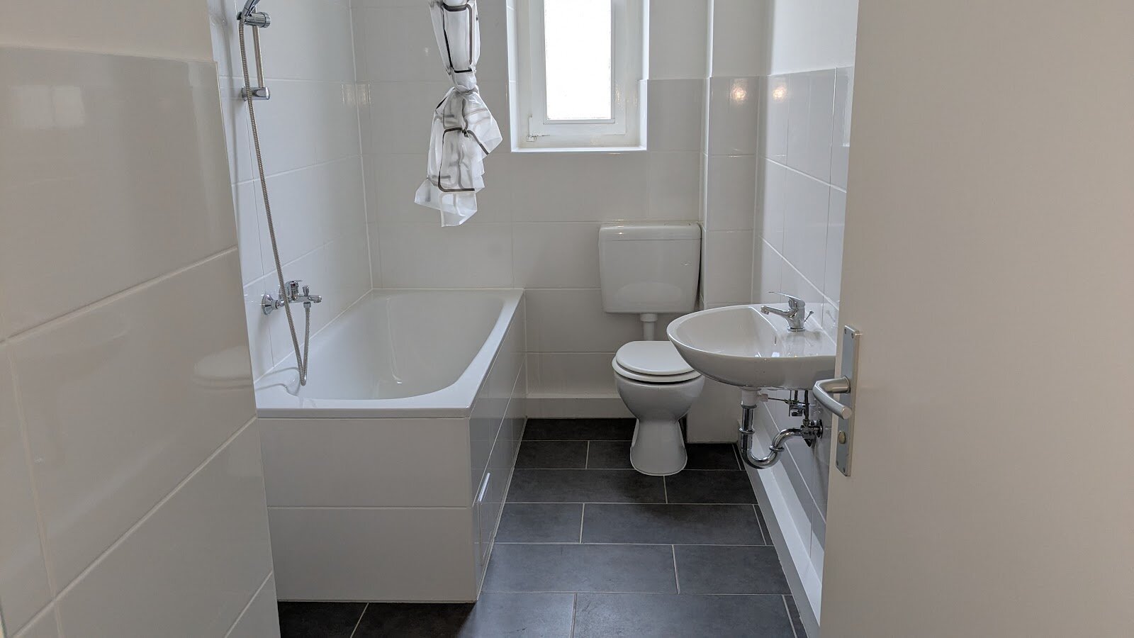 - Anthrazite Boden- und weiße Wandfliesen im Bad