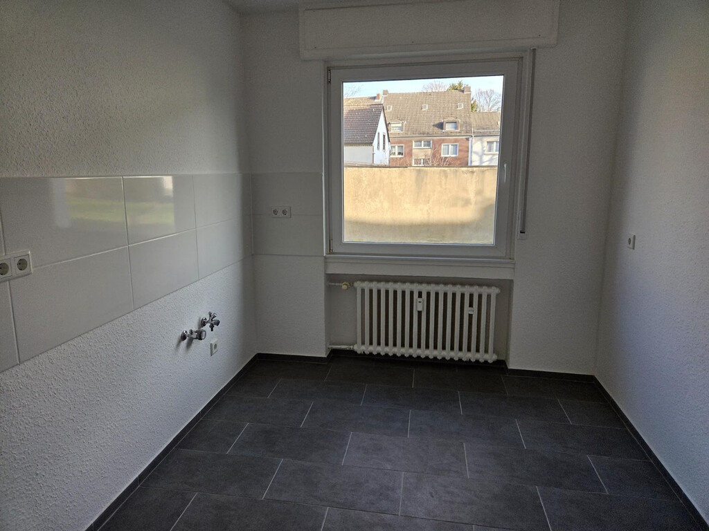 - Anthrazite Boden- und weiße Wandfliesen in der Küche