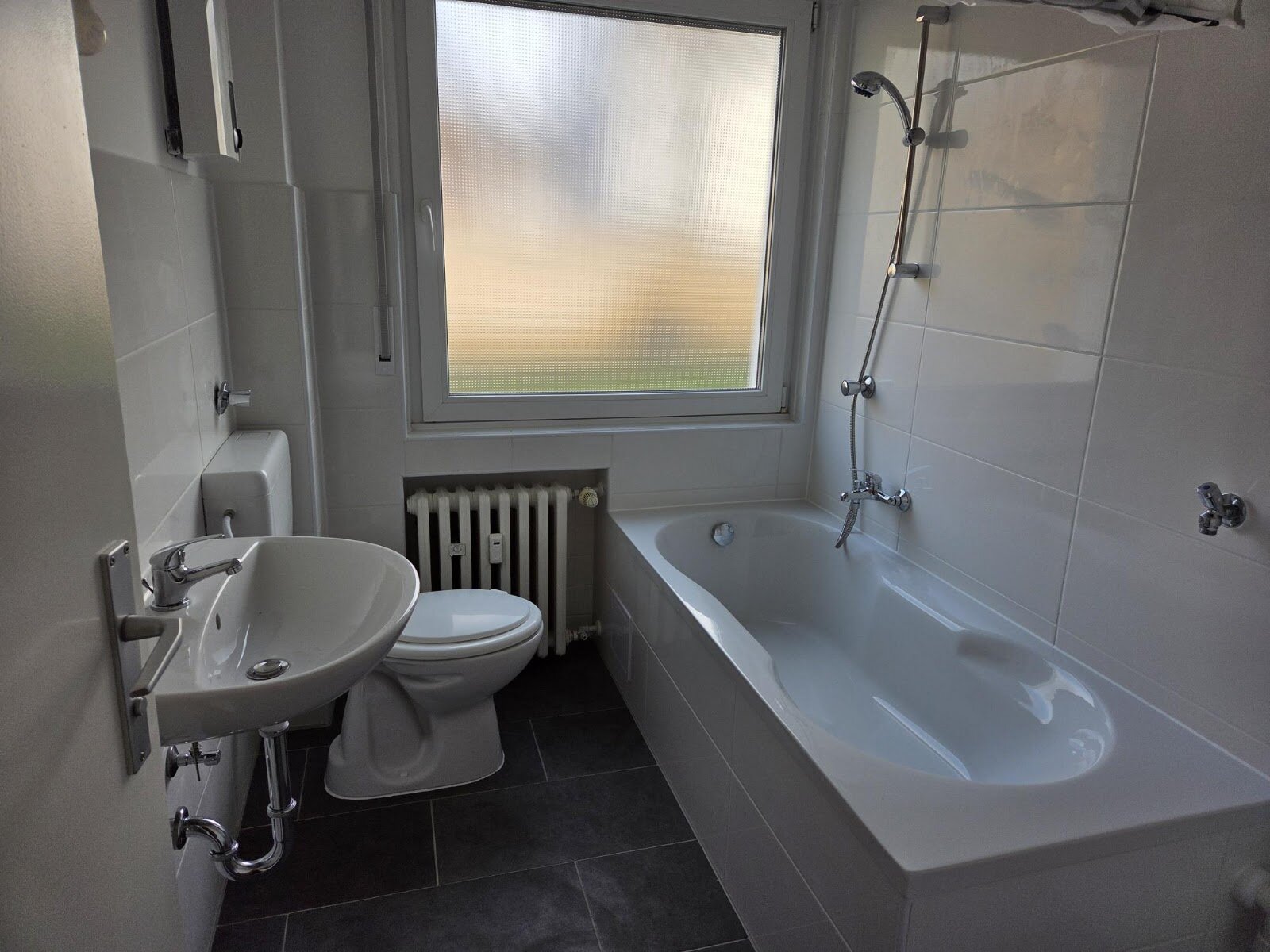 - Anthrazite Boden- und weiße Wandfliesen im Bad