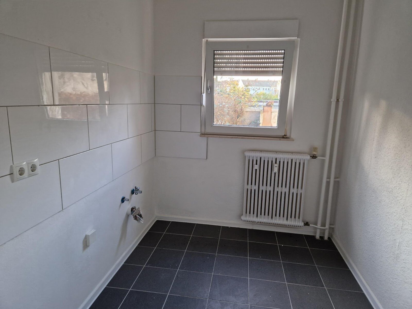 - Anthrazite Boden- und weiße Wandfliesen in der Küche