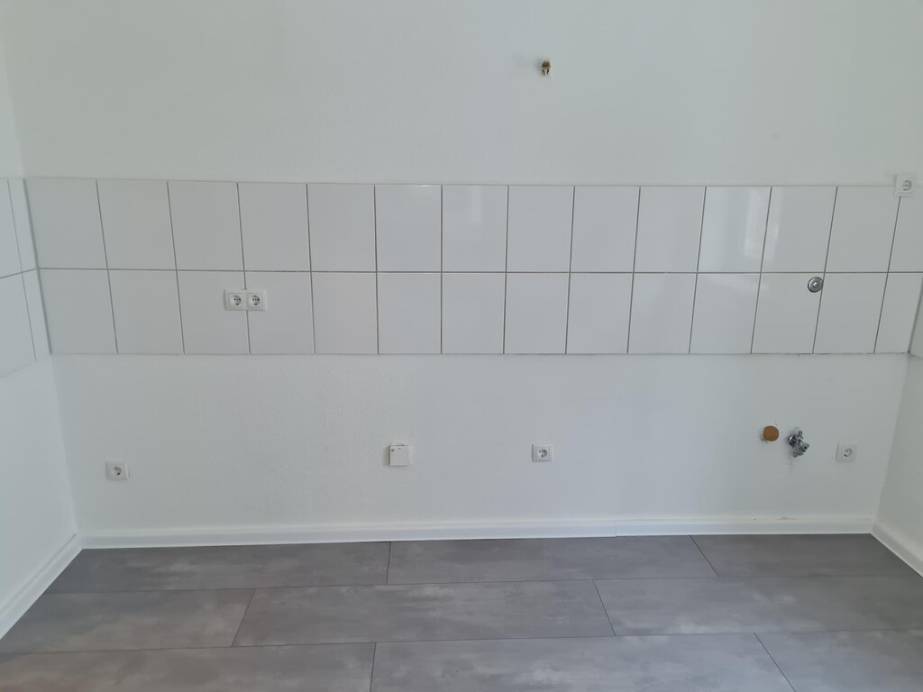 - Anthrazite Boden- und weiße Wandfliesen in der Küche