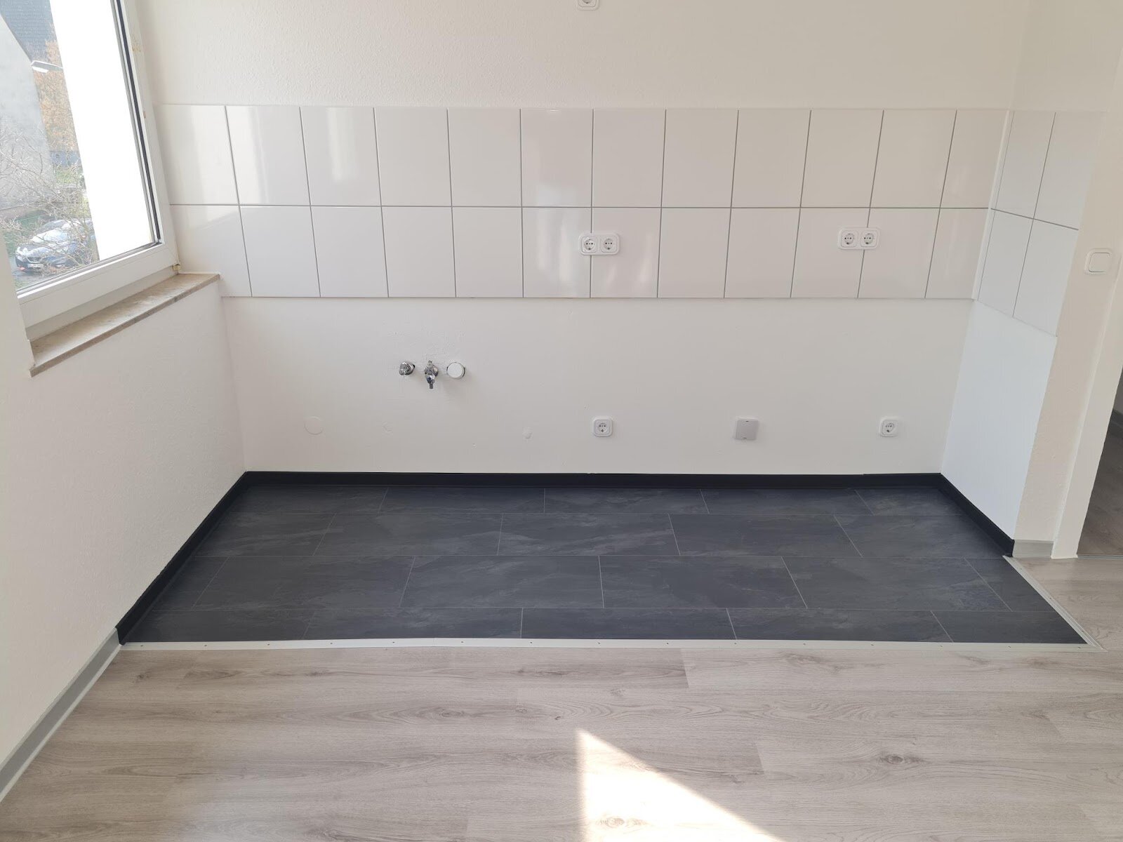 - Anthrazite Boden- und weiße Wandfliesen in der Küche