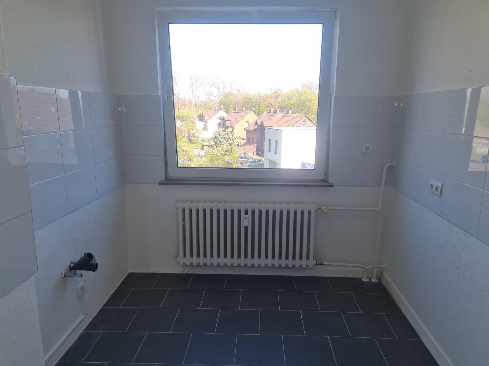 - Anthrazite Boden- und weiße Wandfliesen in der Küche