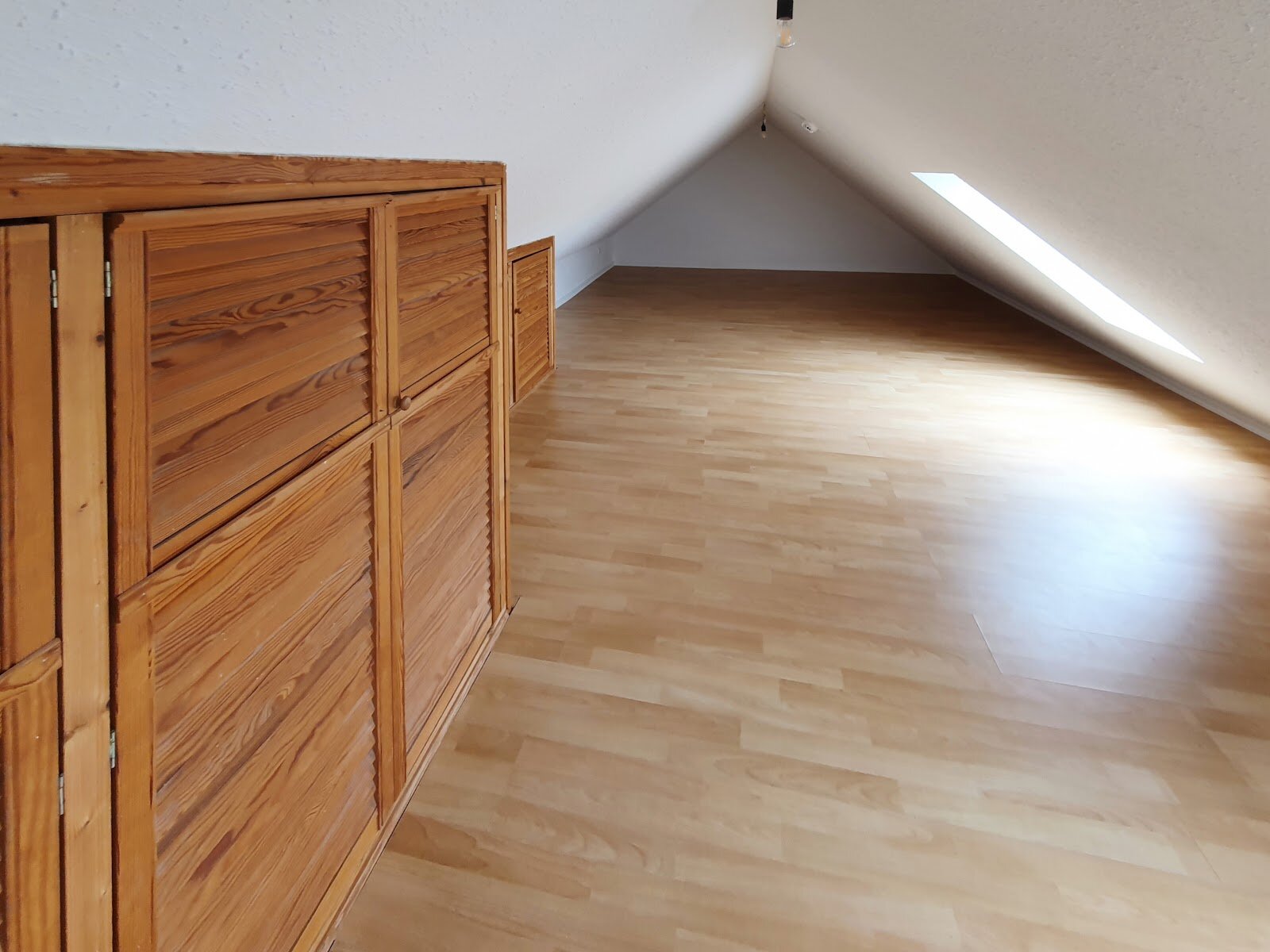 - Laminat- Bodenbelag und Raufasertapete im Schlafzimmer
