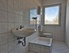 - Weiße Boden- und weiße Wandfliesen im Bad