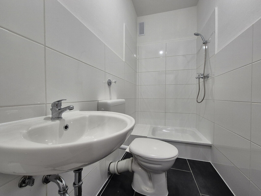 - Anthrazite Boden- und weiße Wandfliesen im Bad