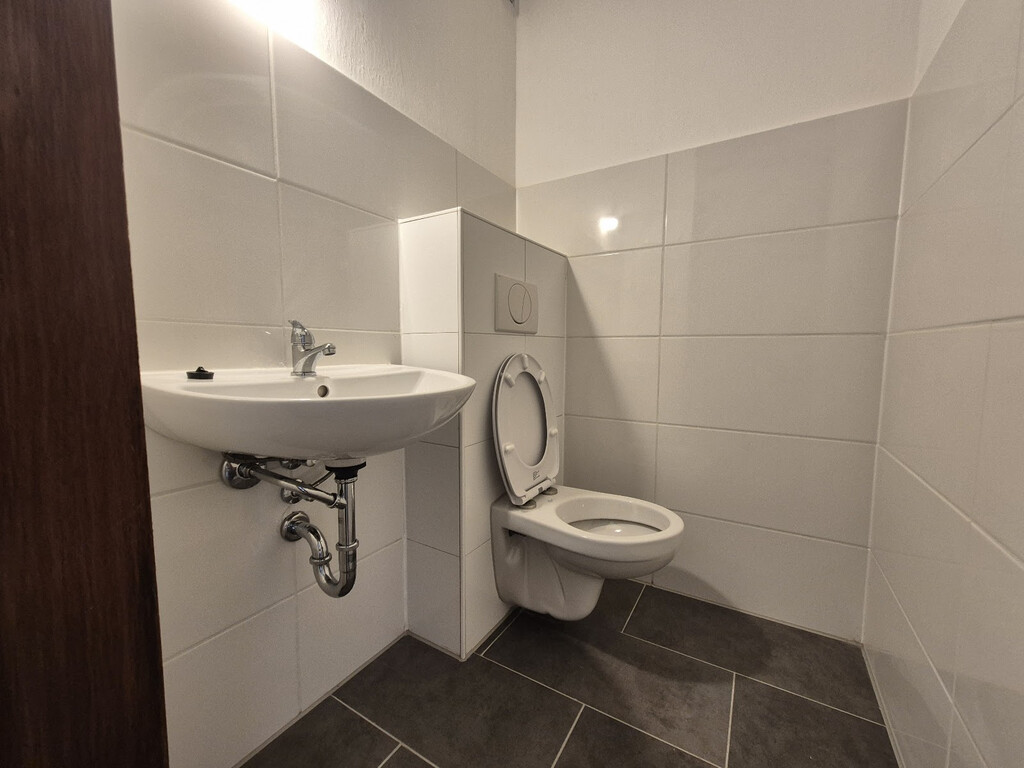 - Anthrazite Boden- und weiße Wandfliesen im Bad