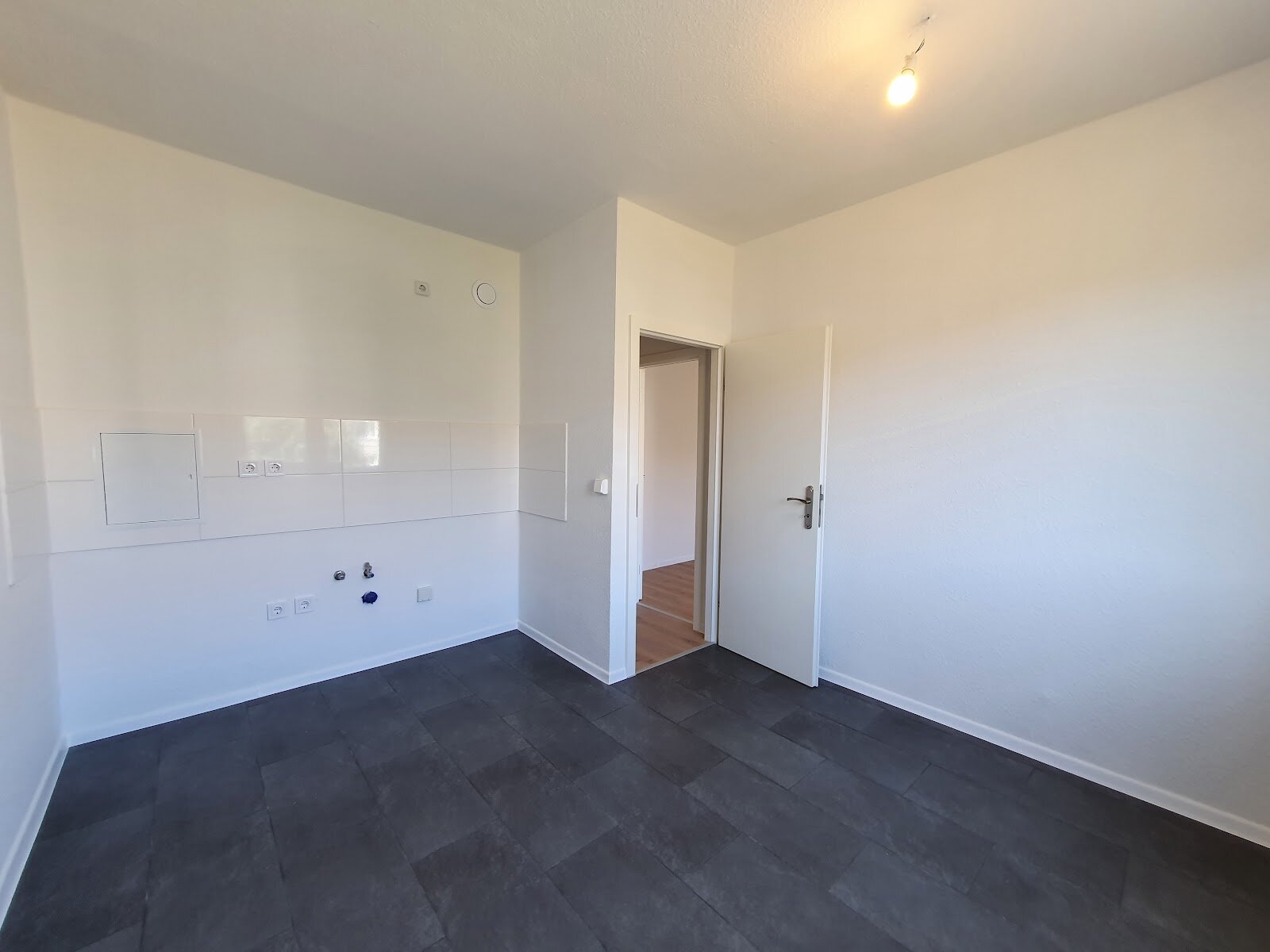 - Anthrazite Boden- und weiße Wandfliesen in der Küche