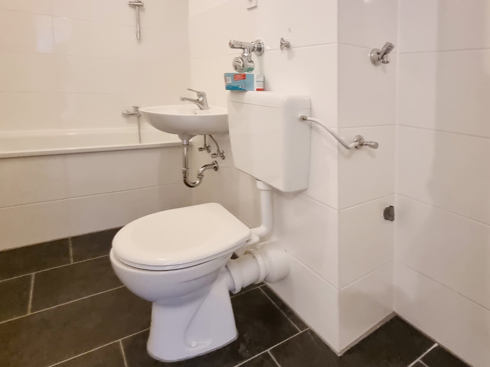 - Anthrazite Boden- und weiße Wandfliesen im Bad