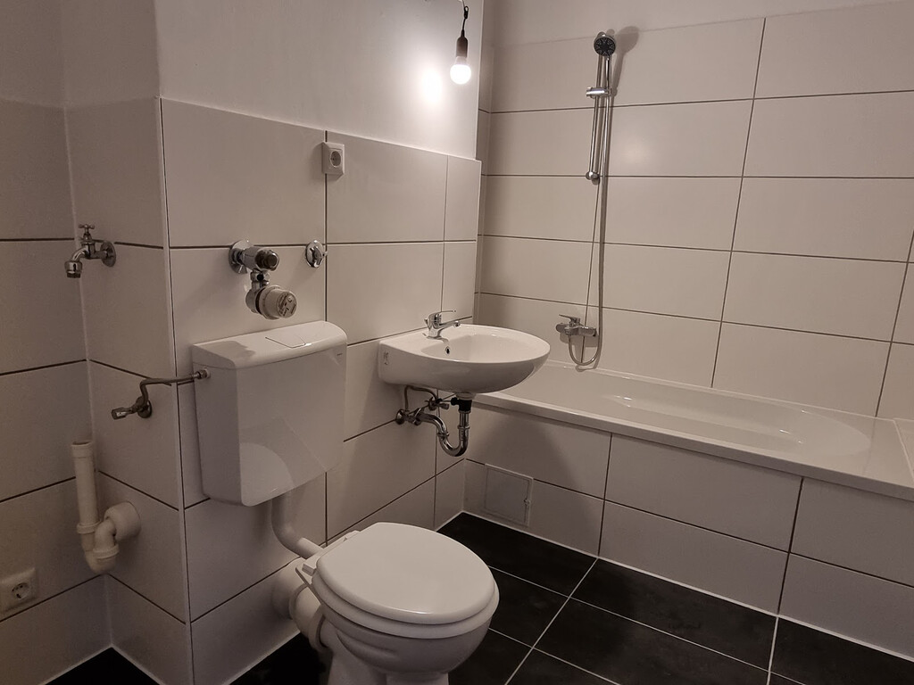 - Anthrazite Boden- und weiße Wandfliesen im Bad
