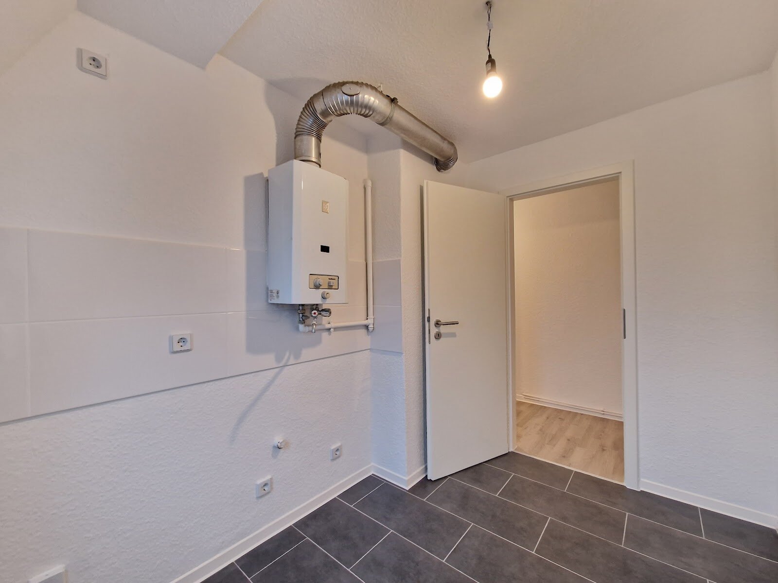 - Anthrazite Boden- und weiße Wandfliesen in der Küche