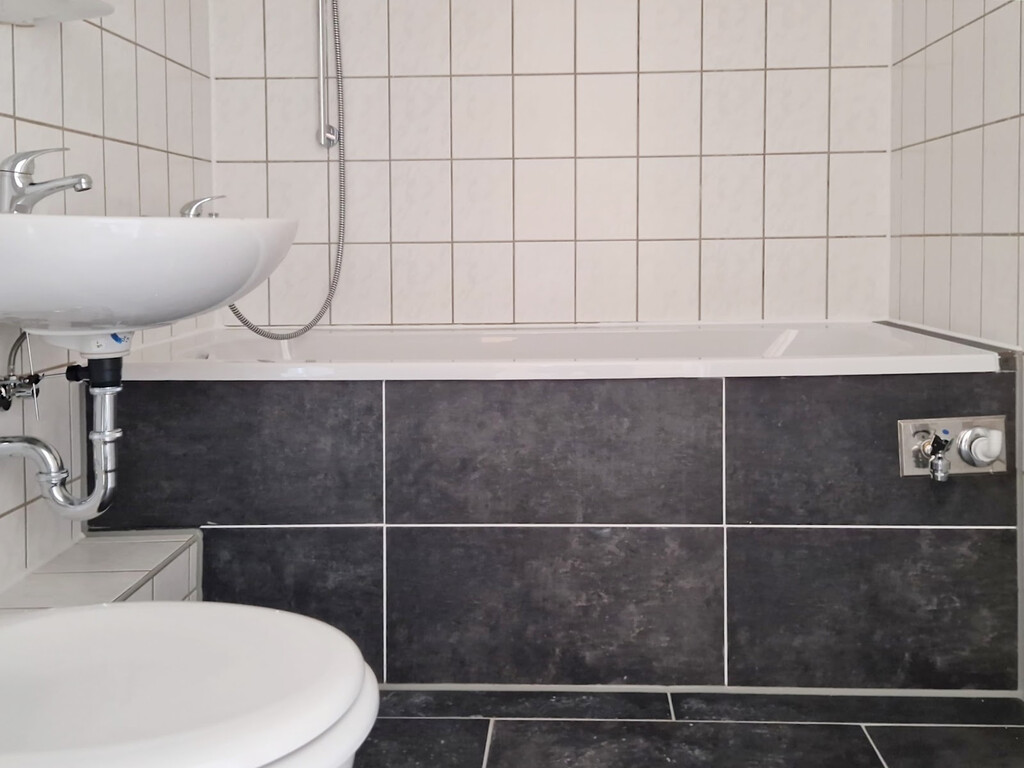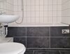 - Anthrazite Boden- und weiße Wandfliesen im Bad
