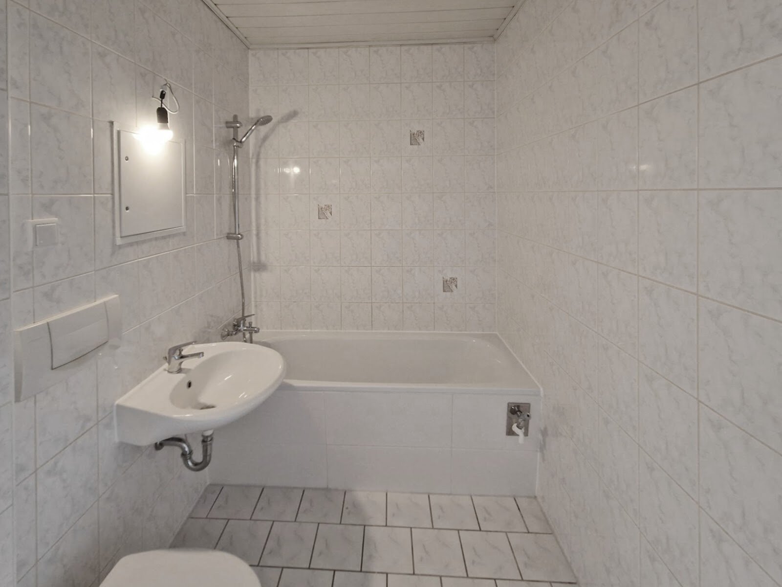 - Weiße Boden- und weiße Wandfliesen im Bad
