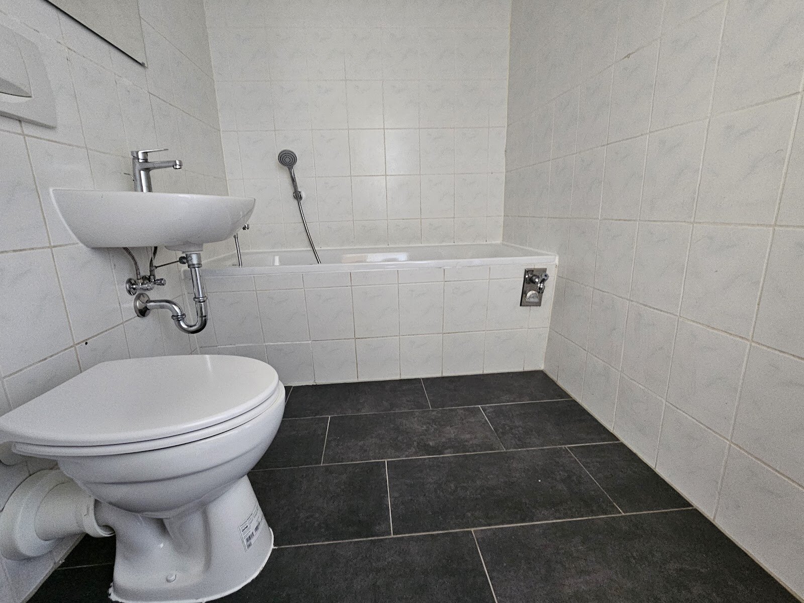 - Anthrazite Boden- und weiße Wandfliesen im Bad