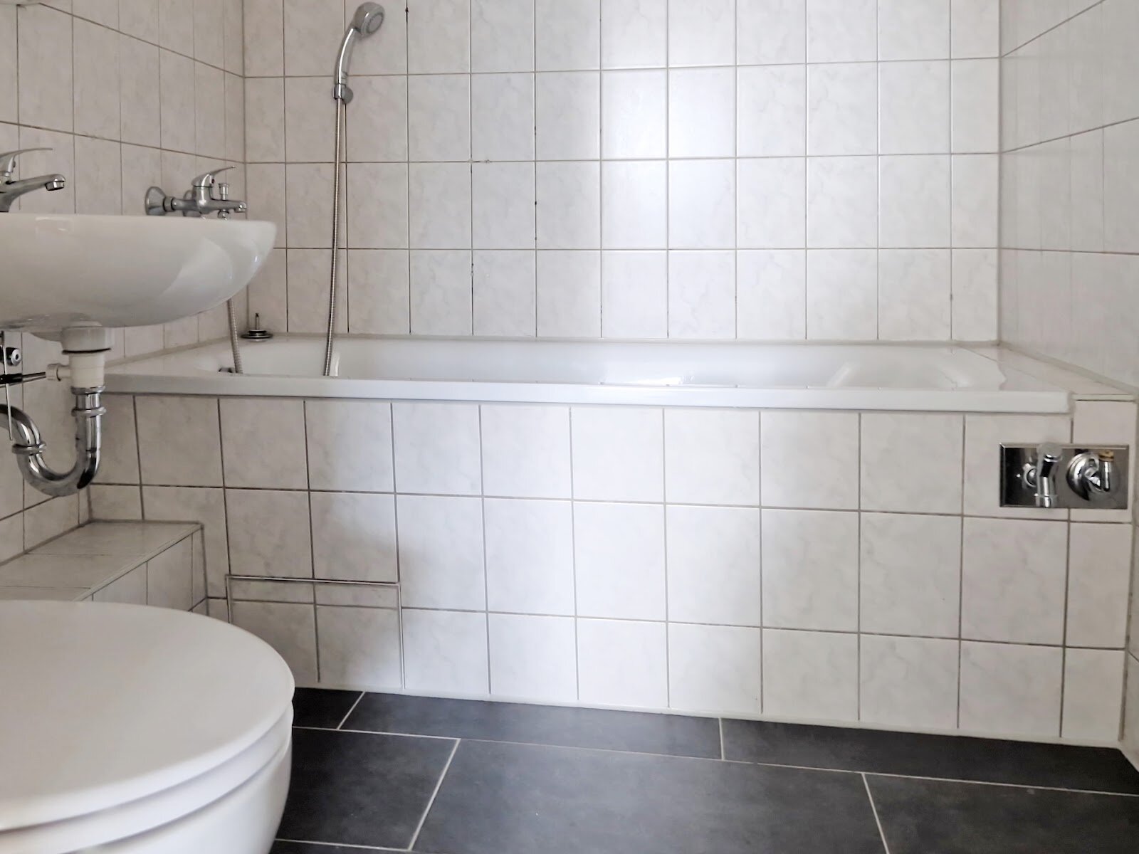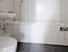 - Anthrazite Boden- und weiße Wandfliesen im Bad