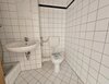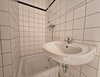 - Weiße Boden- und weiße Wandfliesen im Bad