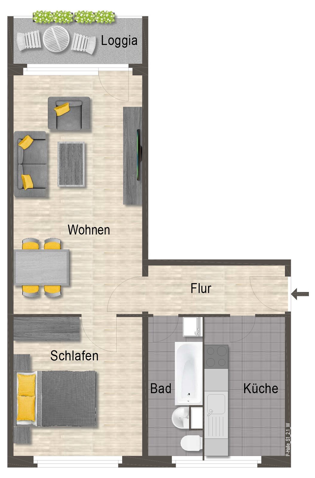 Die 2-Zimmer-Wohnung verteilt sich auf ca. 51 m²