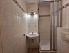 - Weiße Boden- und weiße Wandfliesen im Bad