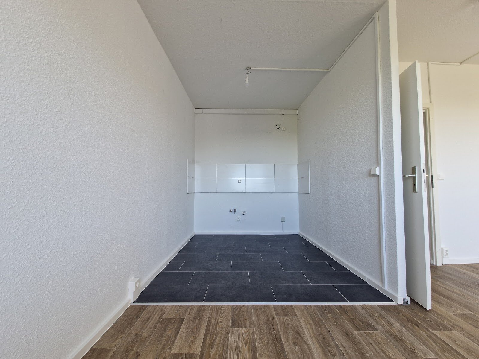 - Anthrazite Boden- und weiße Wandfliesen in der Küche