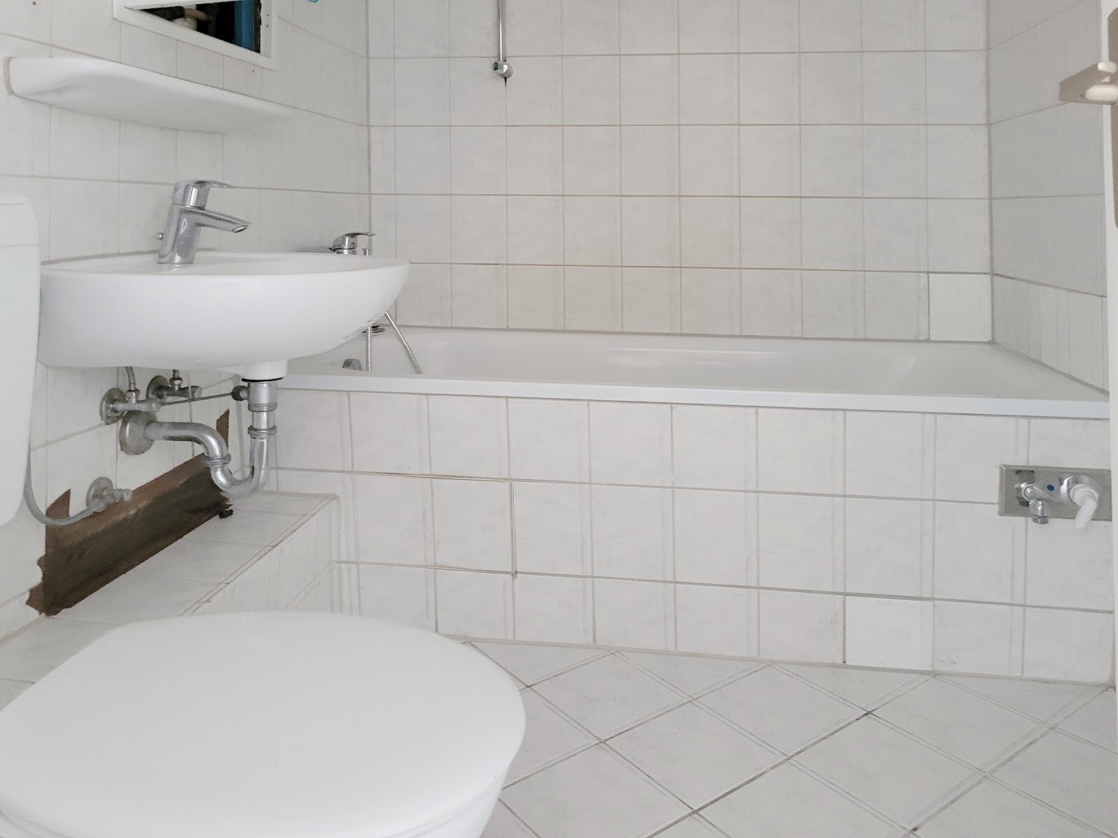 - Weiße Boden- und weiße Wandfliesen im Bad