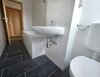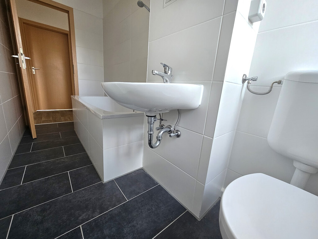 - Anthrazite Boden- und weiße Wandfliesen im Bad