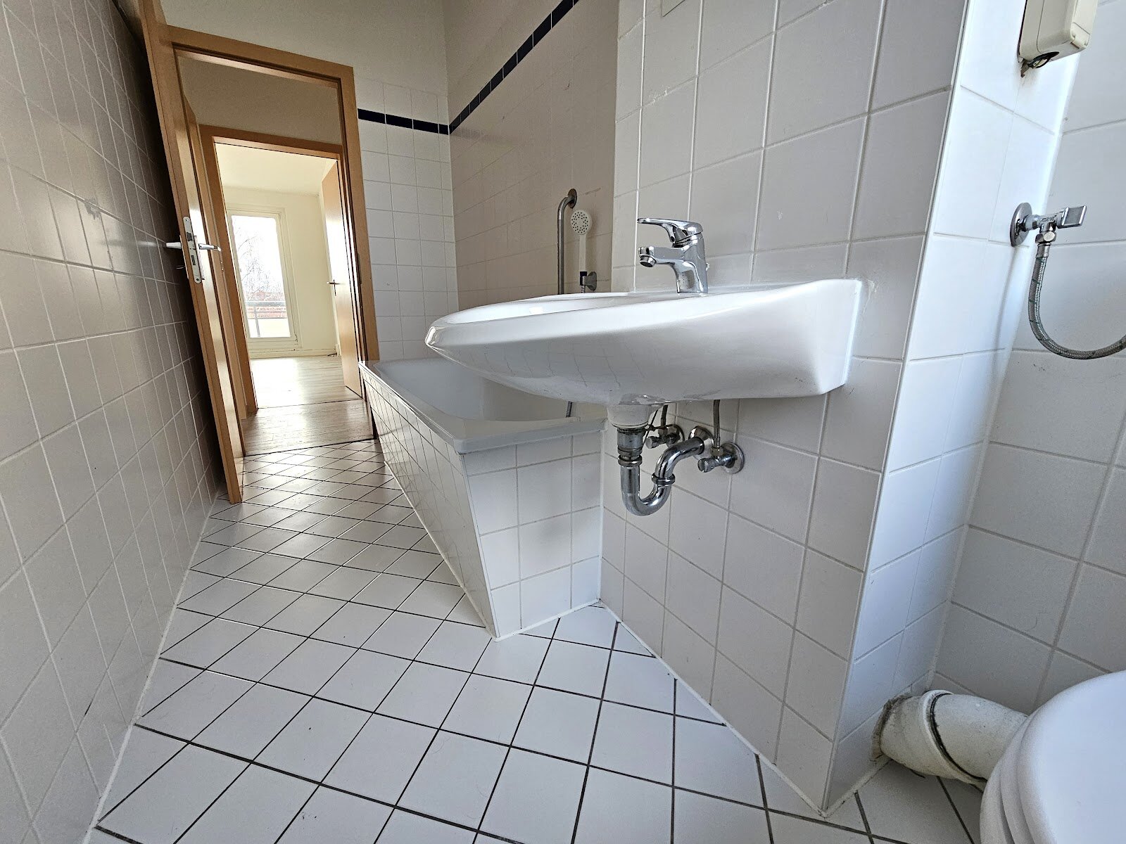 - Weiße Boden- und weiße Wandfliesen im Bad