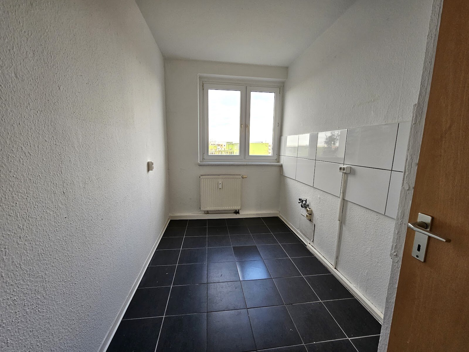 - Anthrazite Boden- und weiße Wandfliesen in der Küche