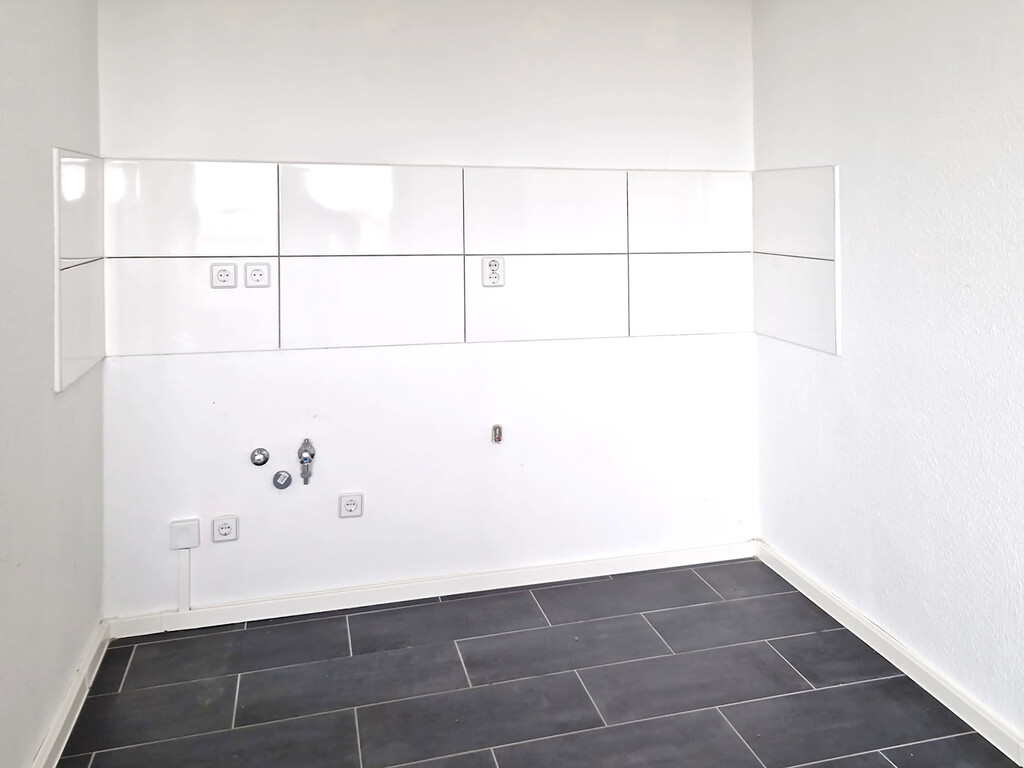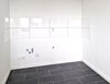 - Anthrazite Boden- und weiße Wandfliesen in der Küche