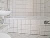 - Weiße Boden- und weiße Wandfliesen im Bad