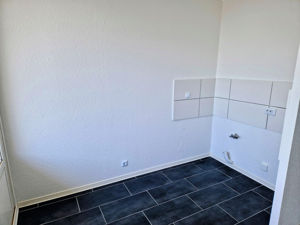 - Anthrazite Boden- und weiße Wandfliesen in der Küche