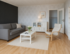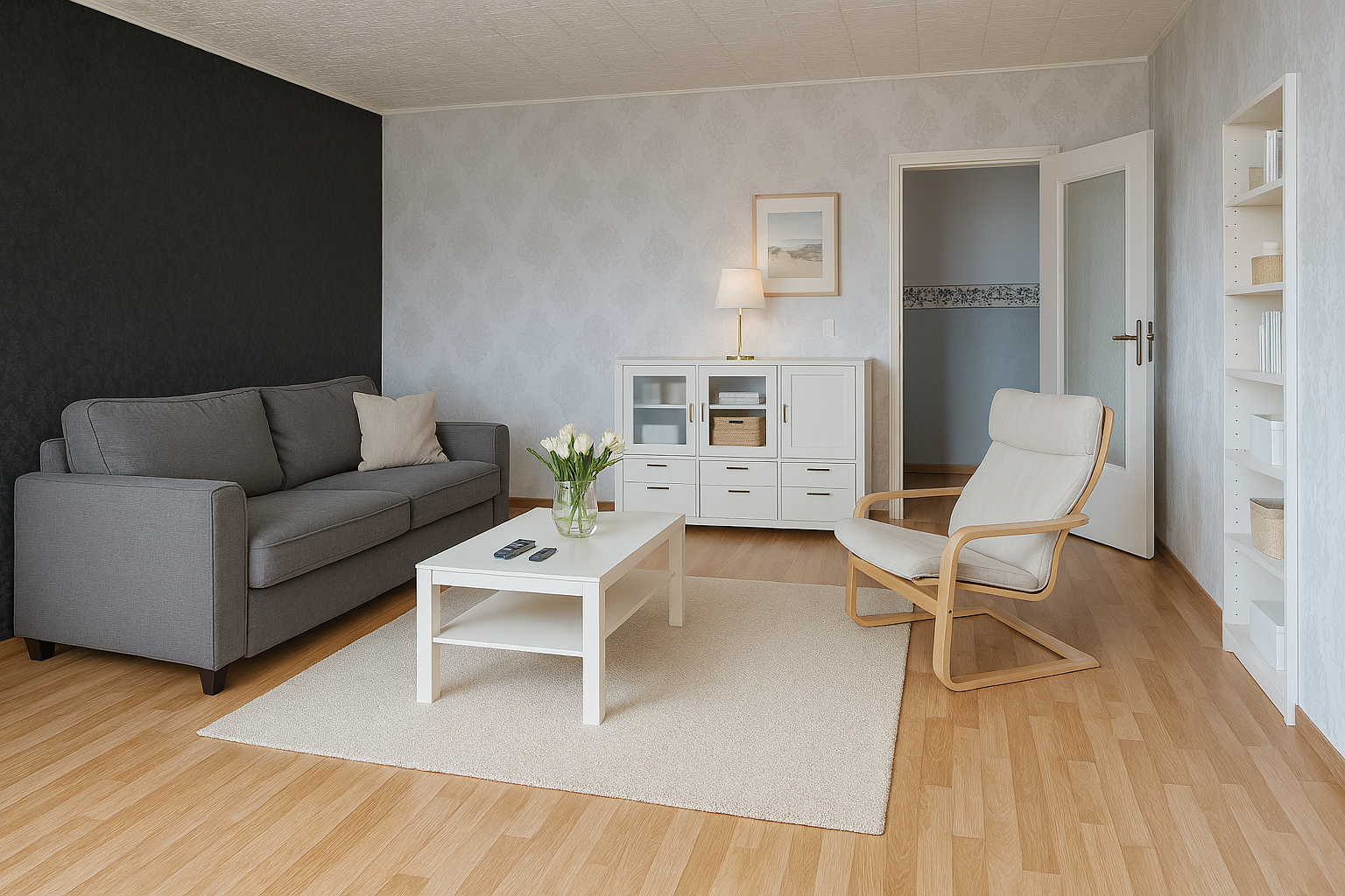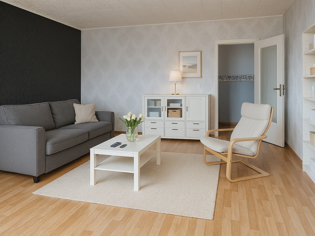 - Laminat- Bodenbelag und Raufasertapete in den Wohnräumen