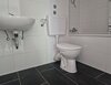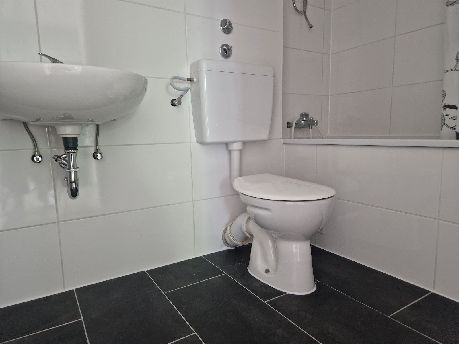 - Anthrazite Boden- und weiße Wandfliesen im Bad