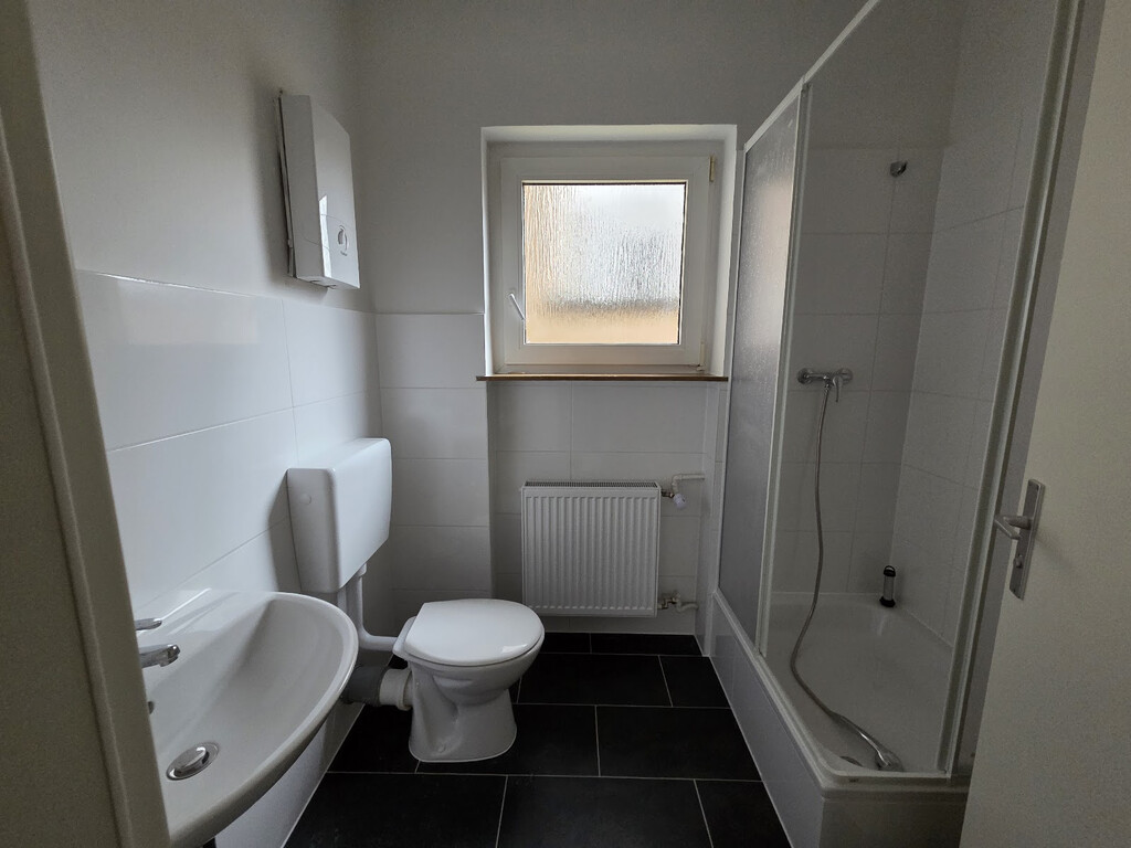 - Anthrazite Boden- und weiße Wandfliesen im Bad