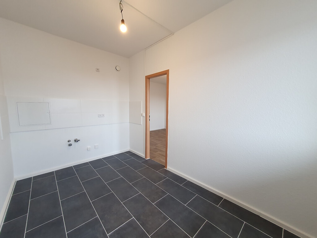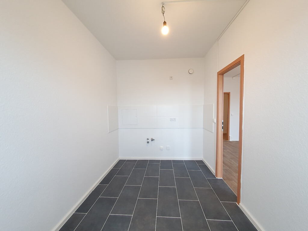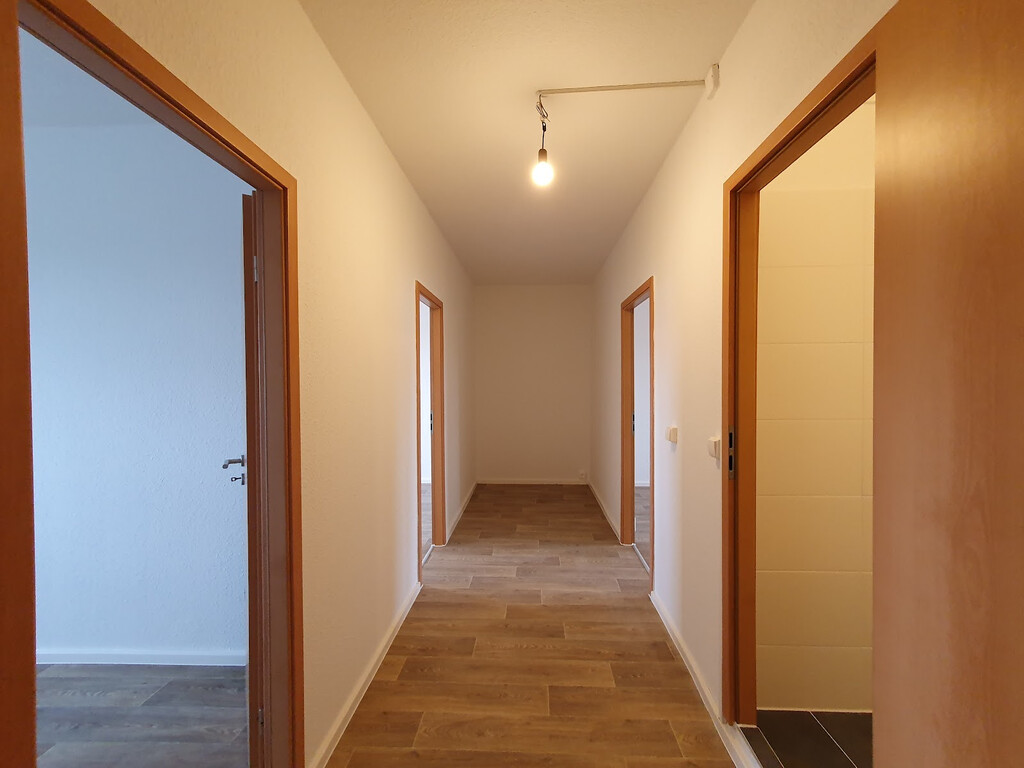 - Wohnbereich mit PVC-Bodenbelag und Raufasertapete – schlicht, pflegeleicht, bereit für Ihre Einrichtungsideen