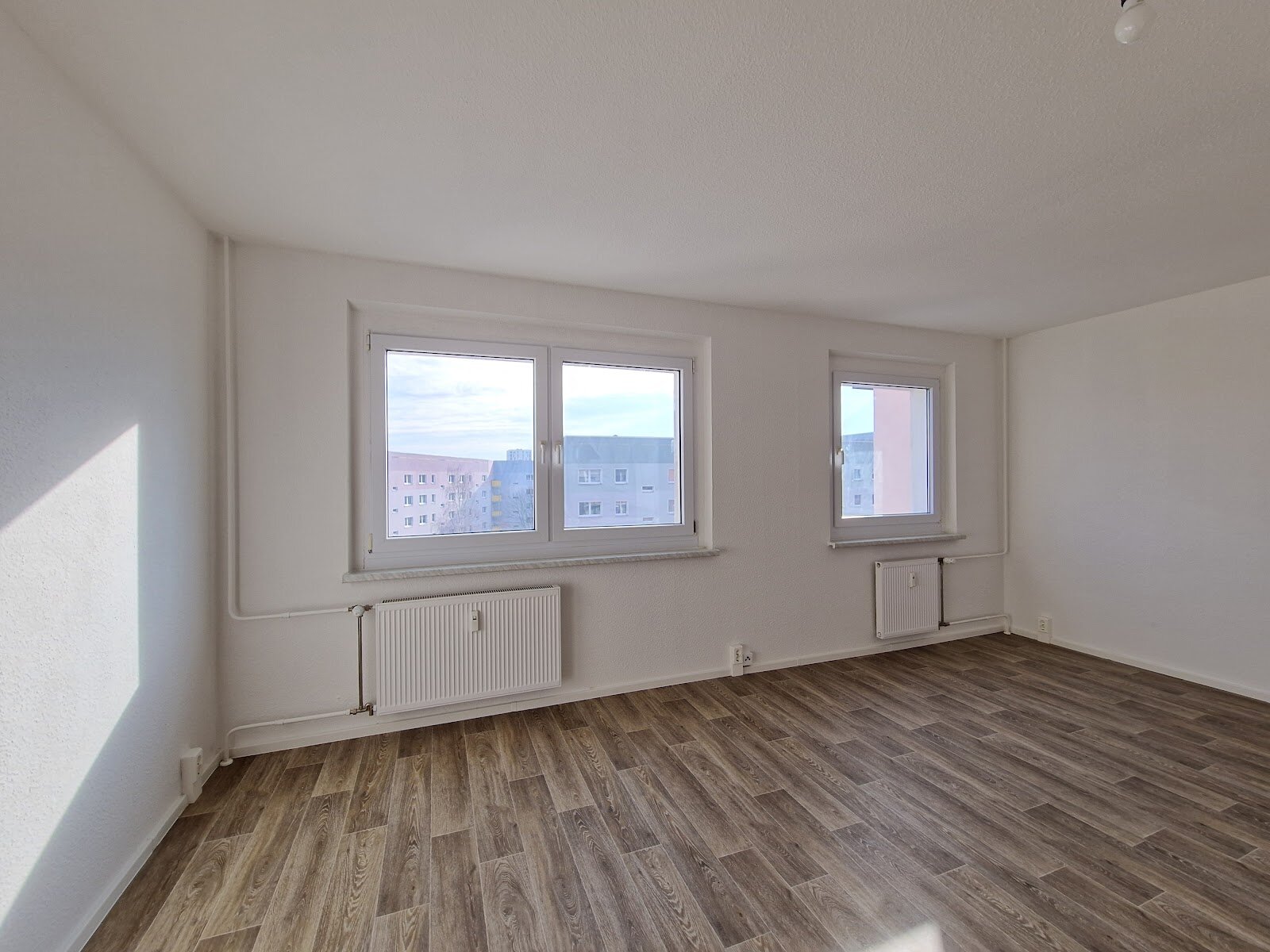 - Wohnbereich mit PVC-Boden und Raufasertapete – schlicht, pflegeleicht, bereit für Ihre Einrichtungsideen