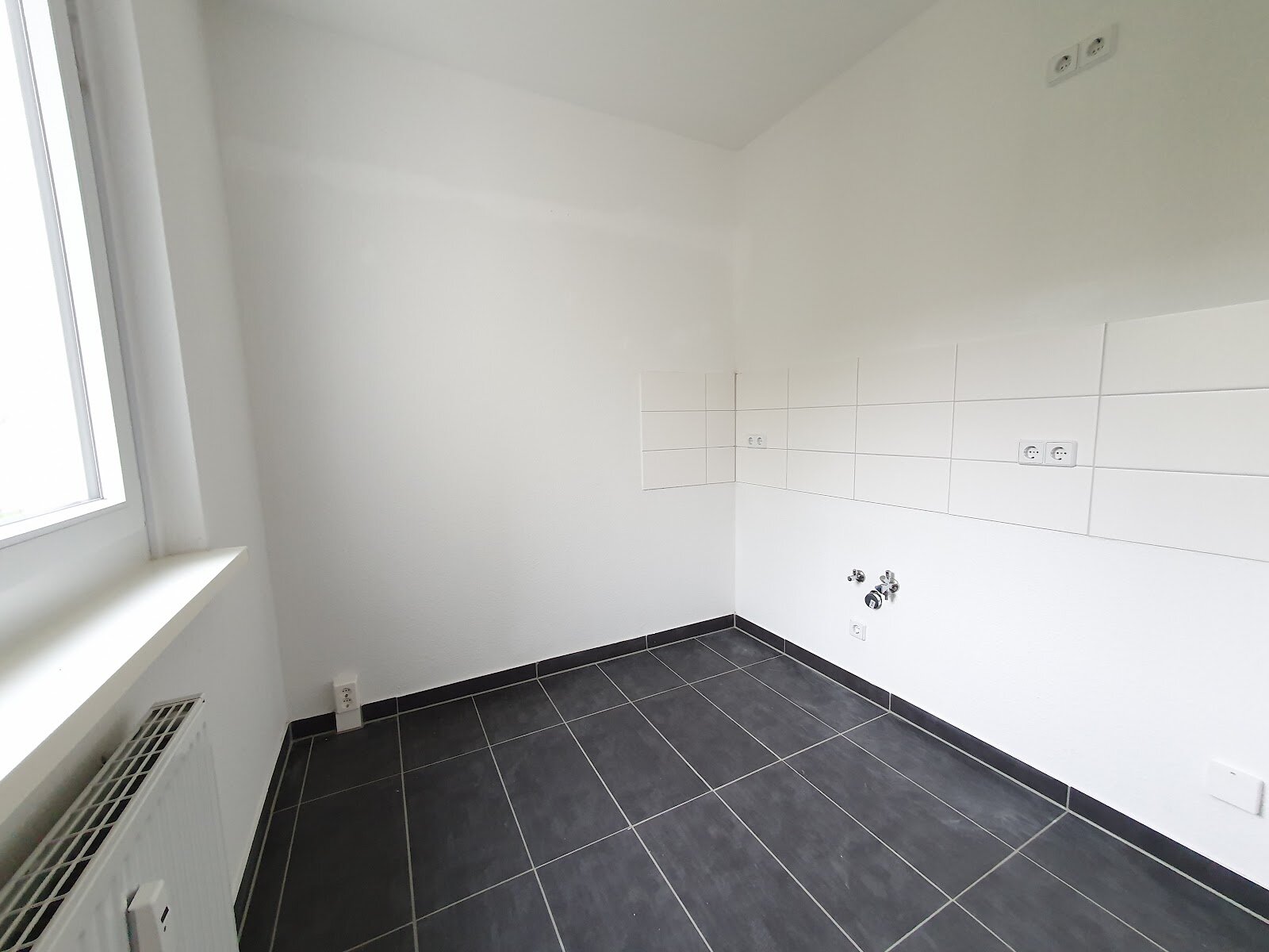 - Wohnbereich mit PVC-Boden und Raufasertapete – schlicht, pflegeleicht, bereit für Ihre Einrichtungsideen