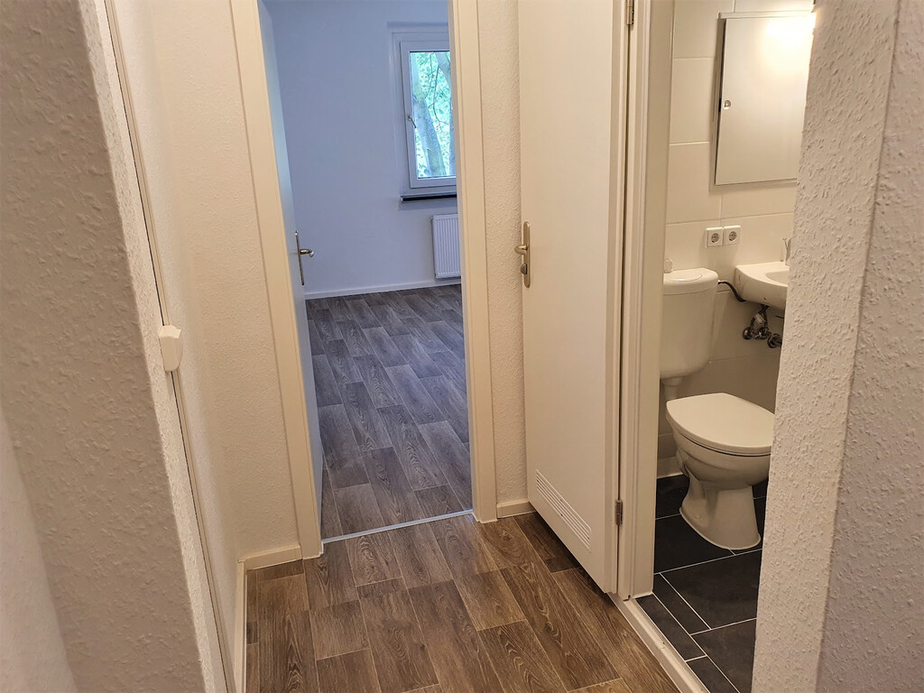 - PVC- Bodenbelag und Raufasertapete in den Wohnräumen