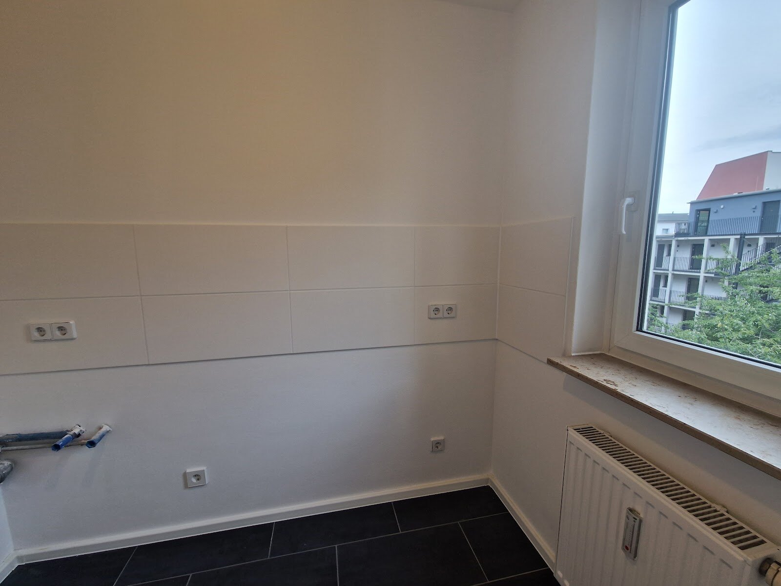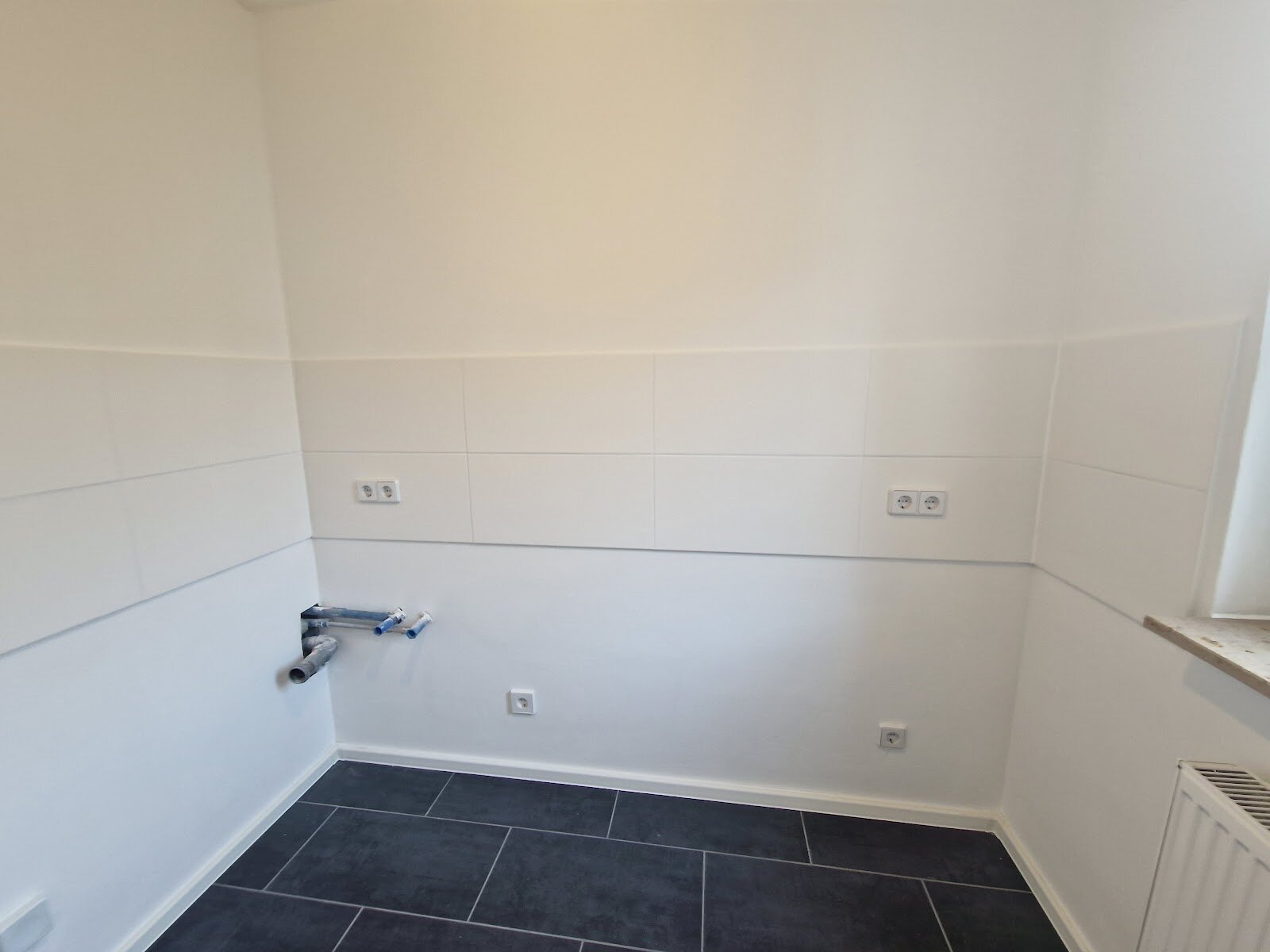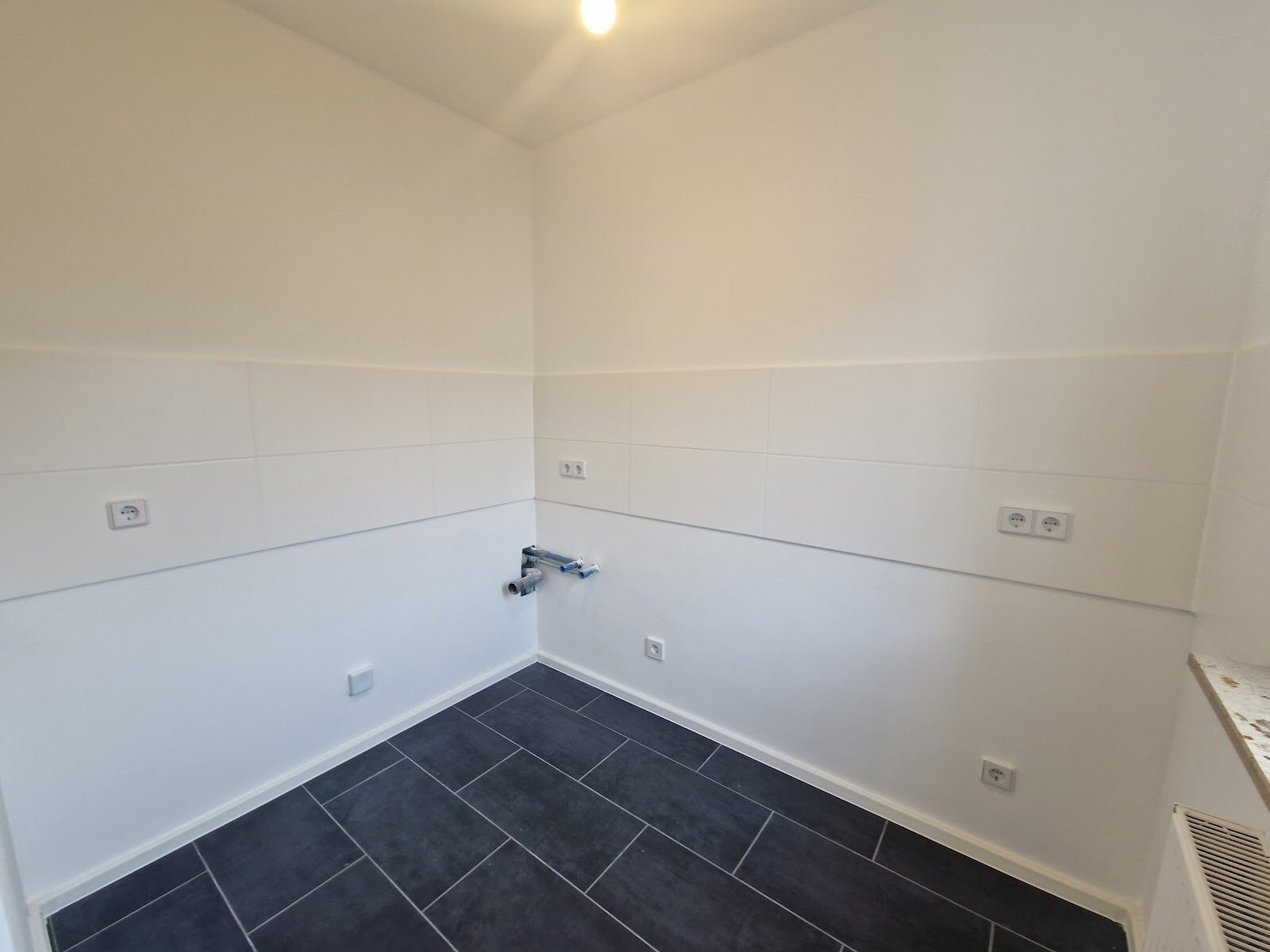 - Wohnbereiche mit PVC-Bodenbelag und weißer Raufasertapete – schlicht, pflegeleicht, bereit für Ihre Einrichtungsideen