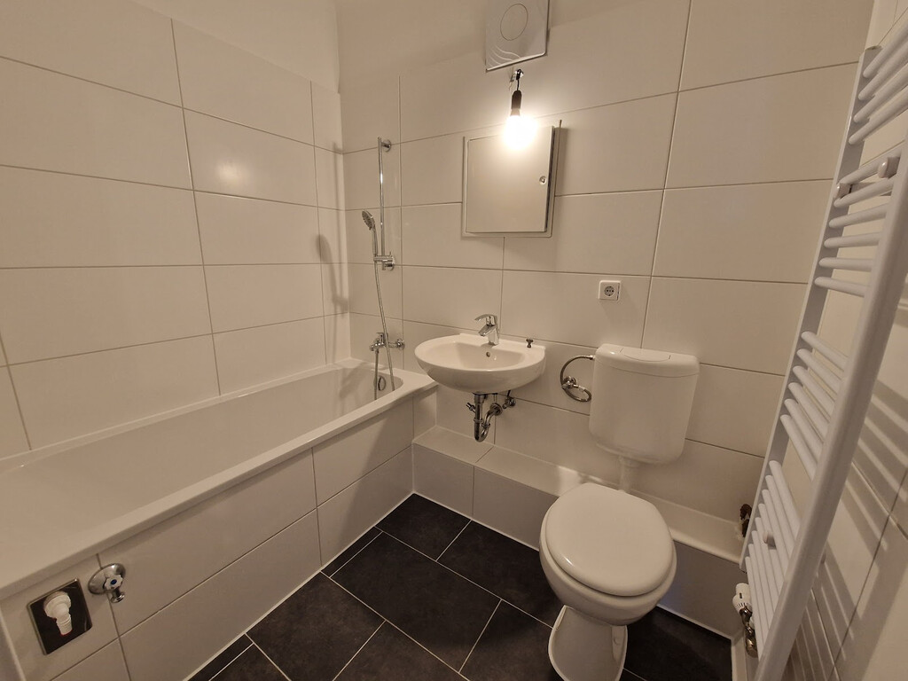 - Modernes Bad mit Badewanne und Waschmaschinenanschluss – praktisch & schick in Anthrazit und Weiß