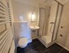 - Badezimmer mit Dusche, Waschmaschinenanschluss und Handtuchheizkörper