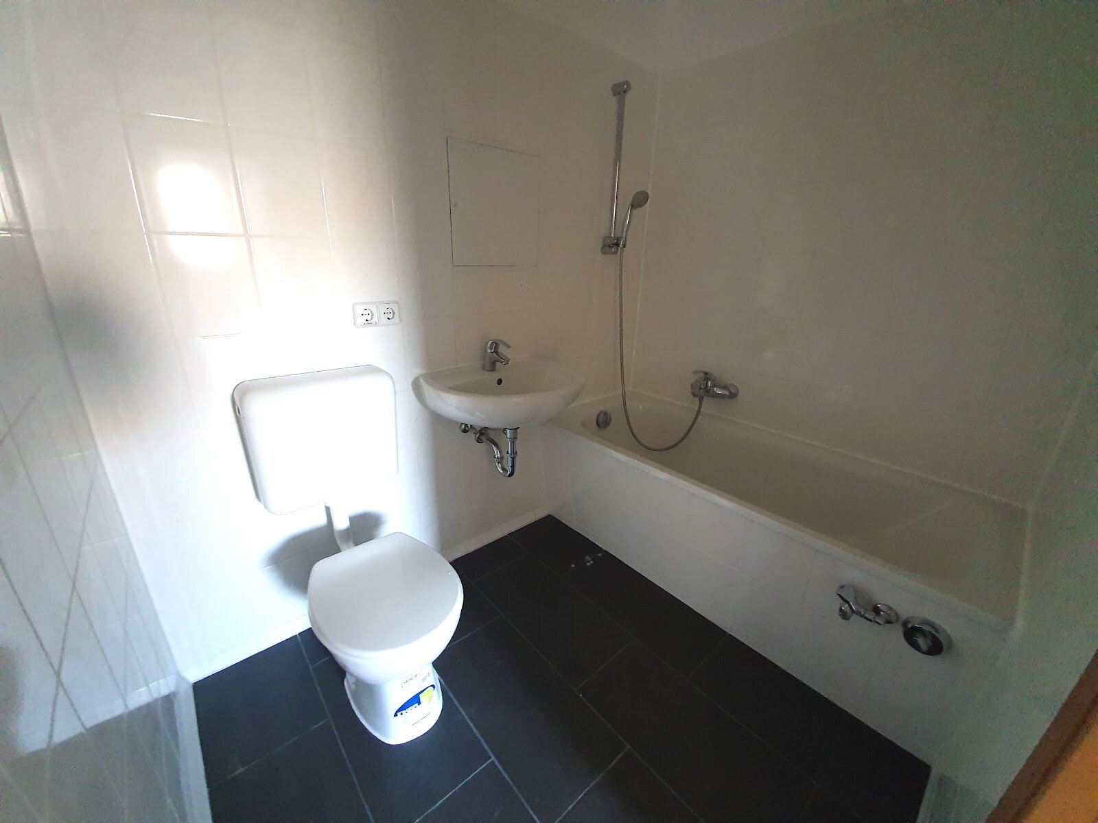 • Badezimmer mit Badewanne und Waschmaschinenanschluss – praktisch & zeitlos in Anthrazit und Weiß