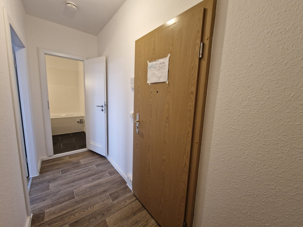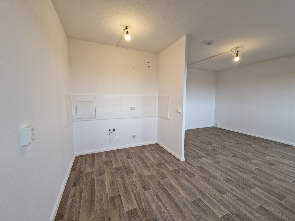 - Wohnbereich mit PVC-Boden und Raufasertapete – schlicht, pflegeleicht, bereit für Ihre Einrichtungsideen