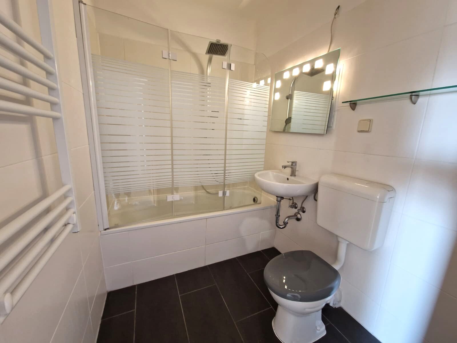 - Anthrazite Boden- und weiße Wandfliesen im Bad