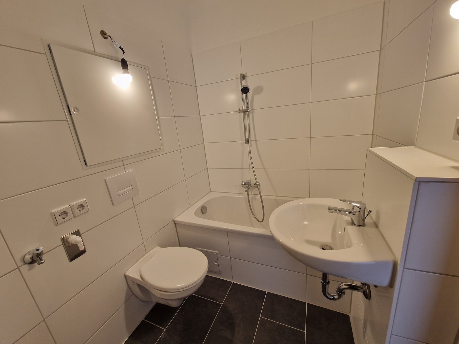 - Anthrazite Boden- und weiße Wandfliesen im Bad