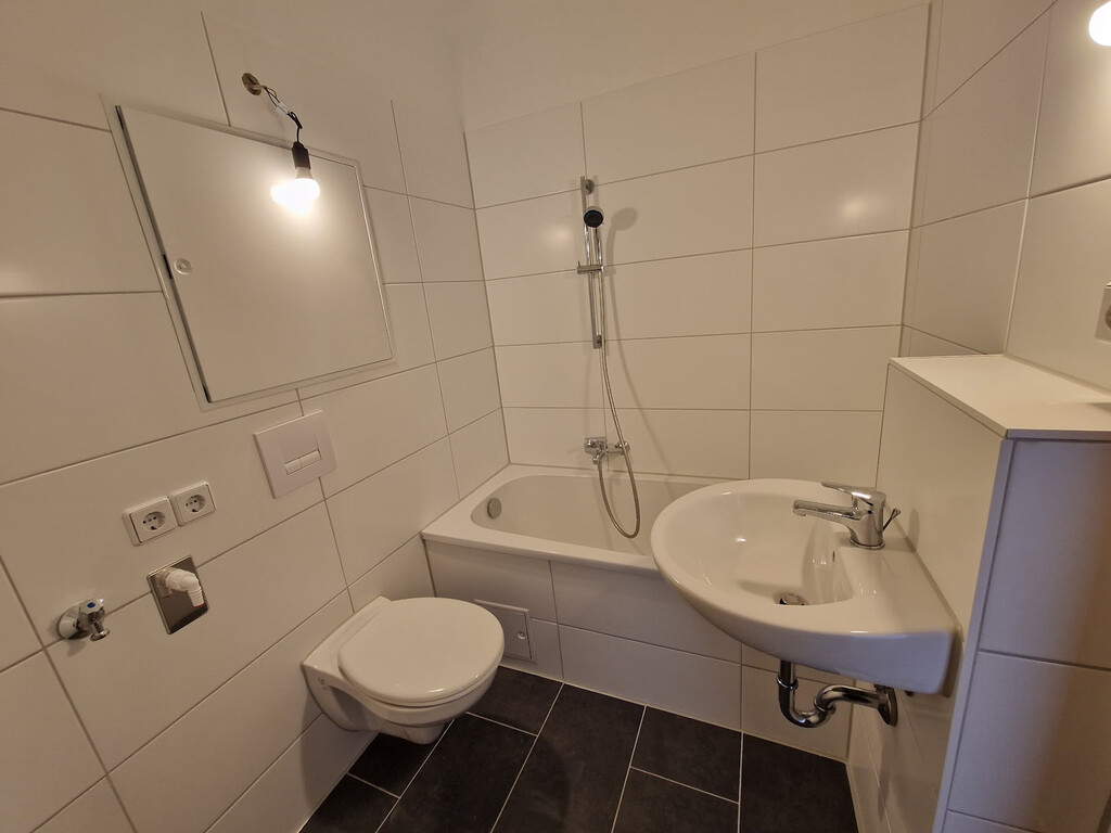 - Badezimmer mit Badewanne und Waschmaschinenanschluss