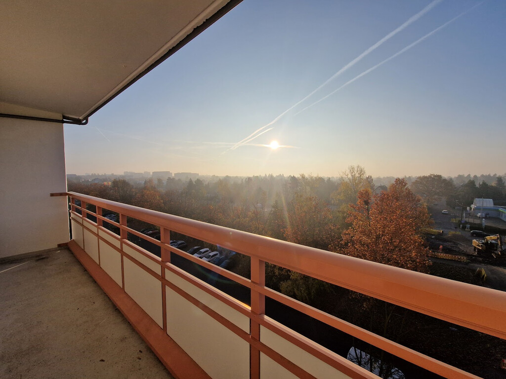 Im 5. Obergeschoss (ganz ohne Fahrstuhl – Fitnessstudio inklusive!) des 1981 erbauten Objektes, wartet diese großzügige 3-Zimmer-Wohnung auf einen neuen Mieter oder eine neue Mieterin mit Sinn für Helligkeit, Charme und Aussicht.