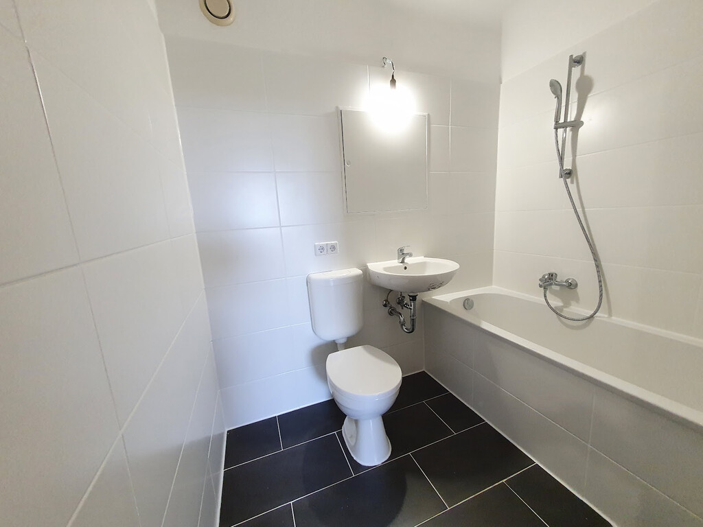 - Badezimmer mit Badewanne und Waschmaschinenanschluss – praktisch & zeitlos in Anthrazit und Weiß