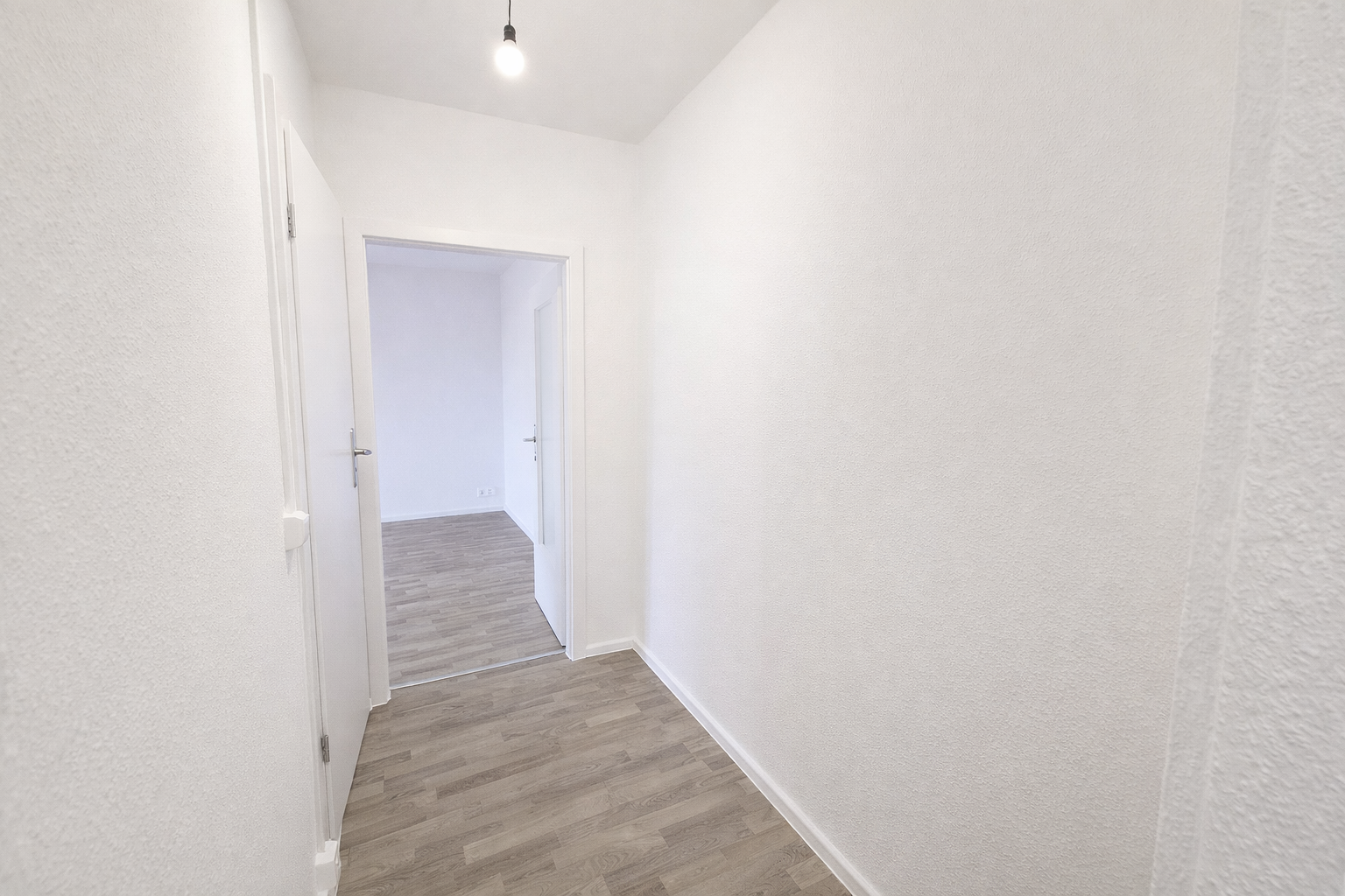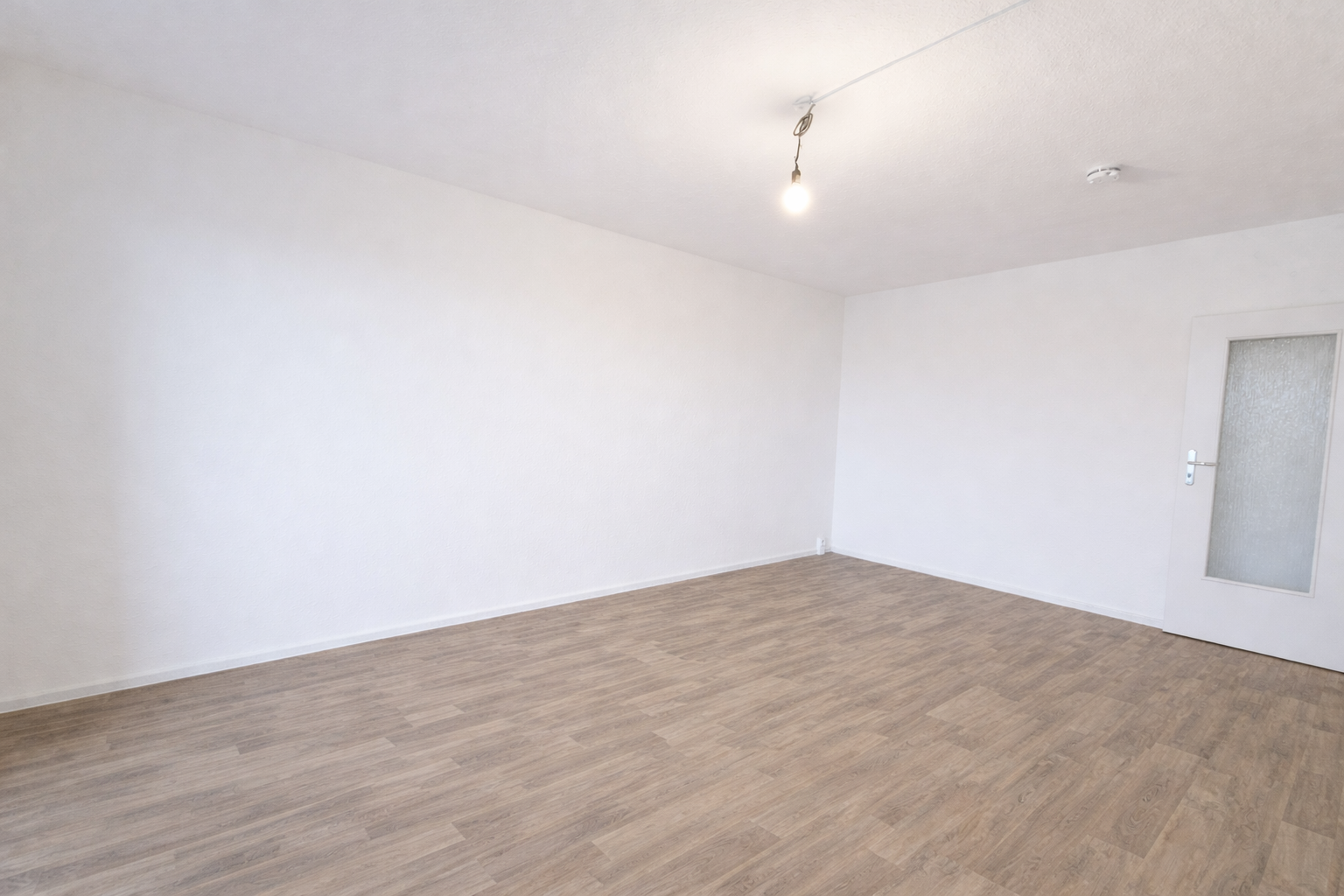 • Geräumiger Wohnbereich mit pflegeleichtem PVC-Bodenbelag und Raufasertapete – neutral gehalten und bereit für Ihre Einrichtungsideen