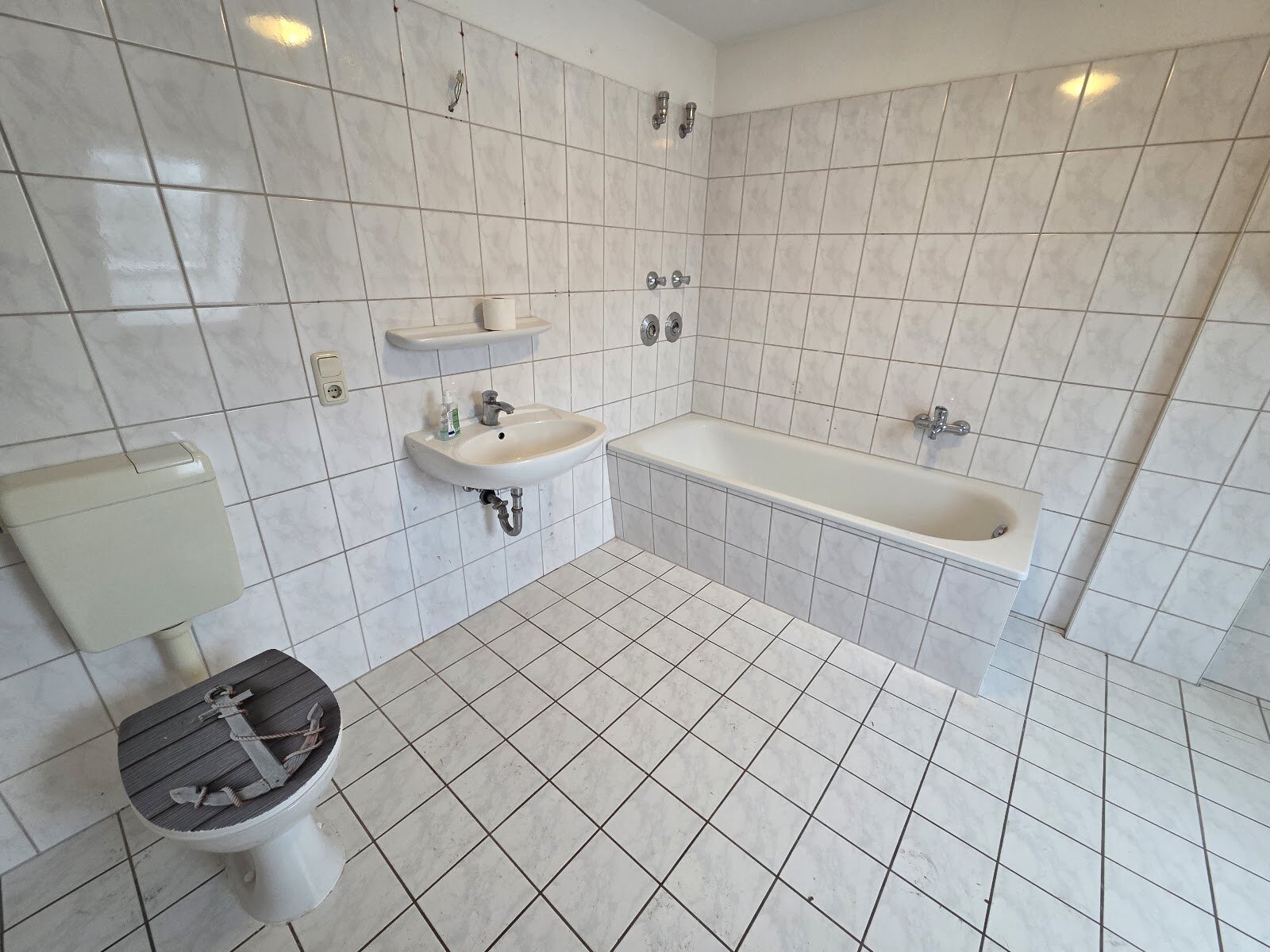 - Weiße Boden- und weiße Wandfliesen im Bad